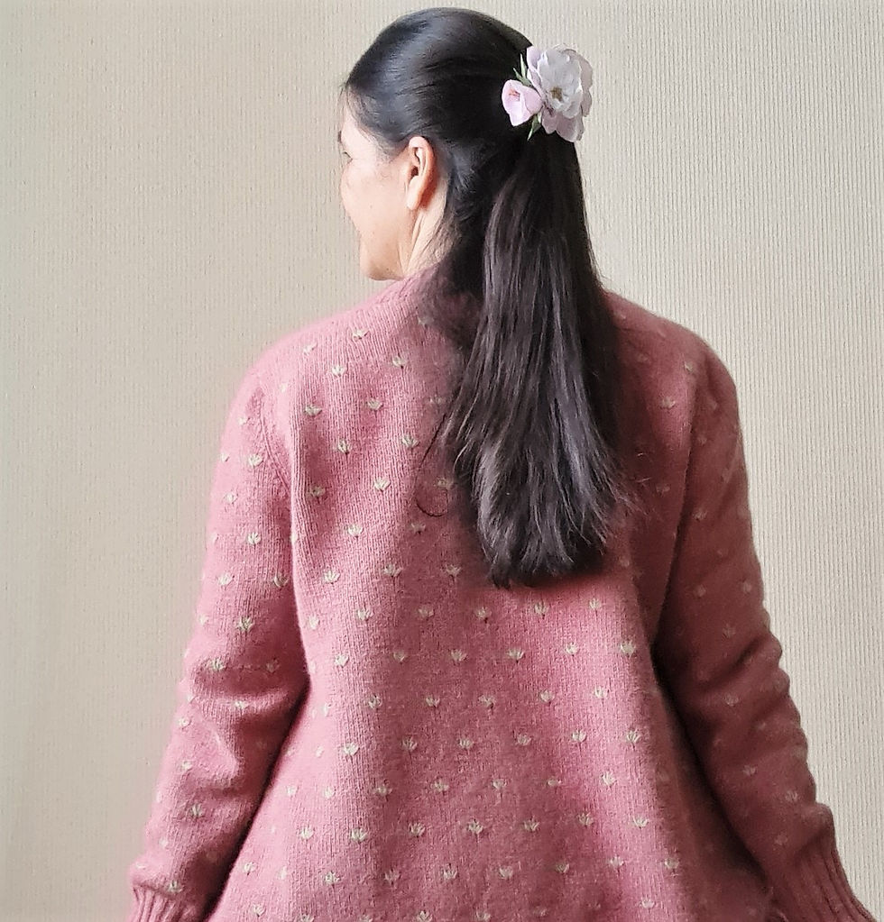 Свободный цветочный кардиган средней длины, прикрывающий бедра. V-образная горловина, втачной рукав, широкие плотные планки, резинки, нерастяжимые петли для пуговиц. Горизонтальные боковые вытачки для груди и вытачки на спинке для лопаток. Накладные карманы, асимметричные проймы и окаты. Прямой силуэт с небольшим расшерением для бедер. "Цветочки" сакуры "вышиты" спицами, используя смешанную технику вязания жаккардов, интарсии и узоров. Протягиваемые нити на изнаночной стороне не провисают.