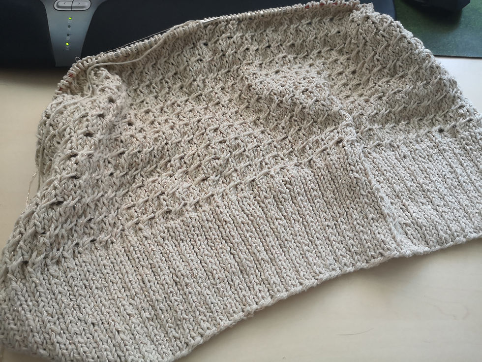 Здравствуйте! Пришла отчитаться, что начало Seashell положено. "Горизонт" довязывался медленно, поскольку много работы было, которая постоянно отвлекала. А сейчас на улице +10 - + 13 и зарядили дожди, поэтому вяжу в удовольствие, уже готов кусочек спинки.😊