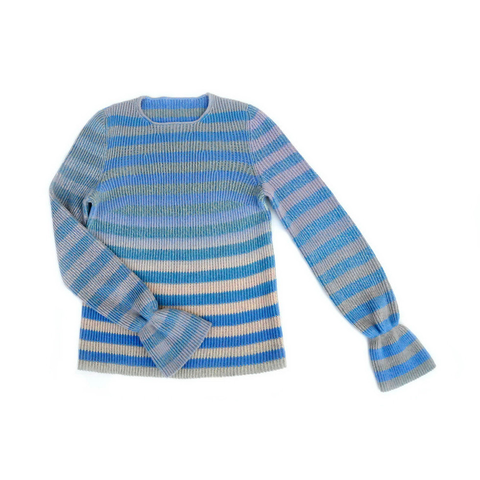 Let's switch to another topic. If you ever made a striped sweater, you were supposed to find out, that stripes and left-leaning low slopes are not the best friends: shoulder slopes, caps on drop-shoulder sleeves, short rows. You must either break yarn and attach the new one at the beginning of every stripe or carry non-working yarn all the way, twisting it with the working yarn. The seam then becomes thick and non-elastic. It does not help to achieve accuracy when finishing. One way you can avoid this situation is to interrupt the striped pattern and knit the slope in one color. The examples below will clarify the situation better (click the arrow to see more).