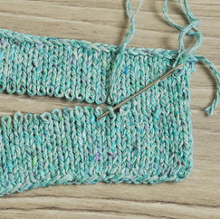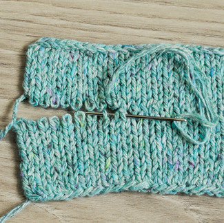 First, you separate a piece of the rib by pulling out the yarn; then knit a longer rib. Before pulling out the knitting needle, it is recommended to steam and press the rib still on the knitting needle to fix the stitches. The knitting needle can also be left and stitches removed one by one as we graft them.